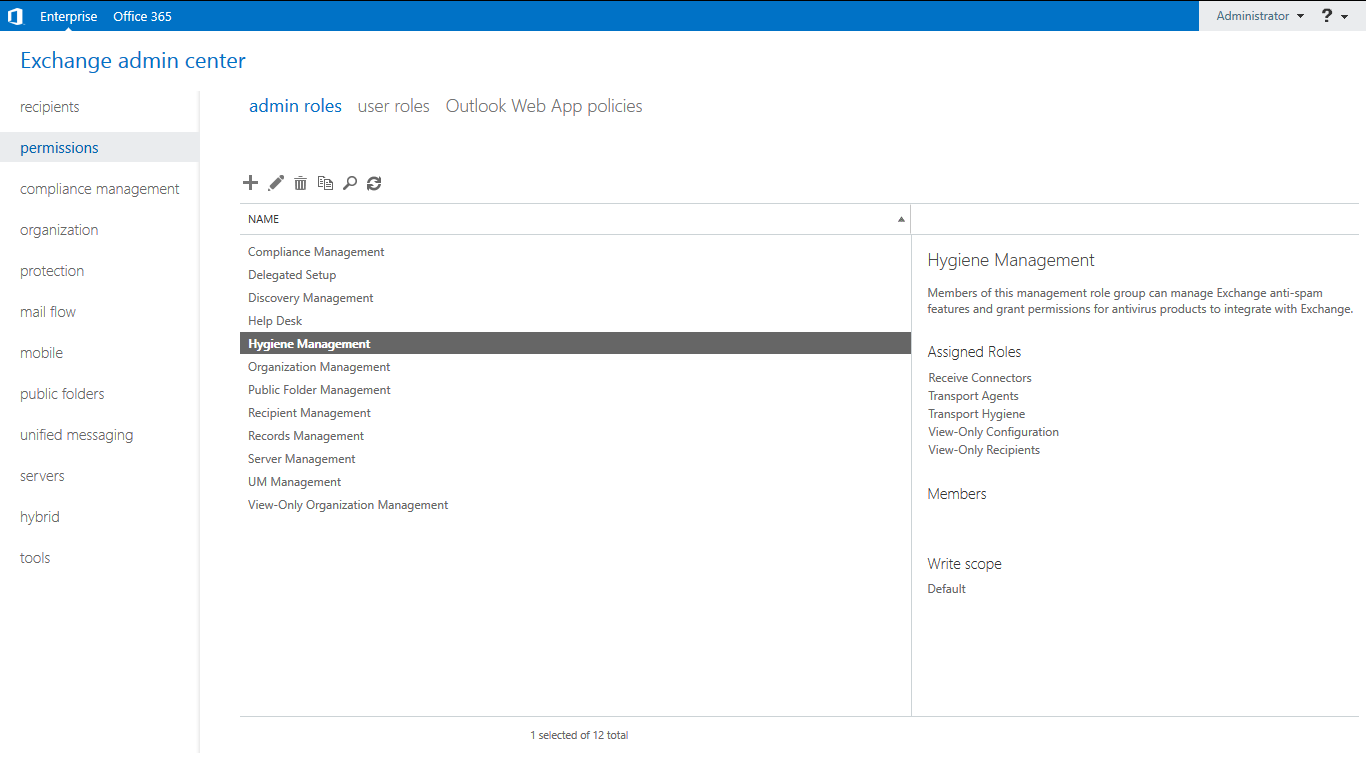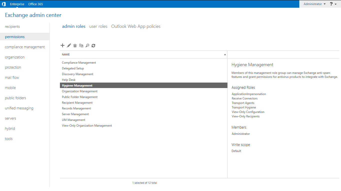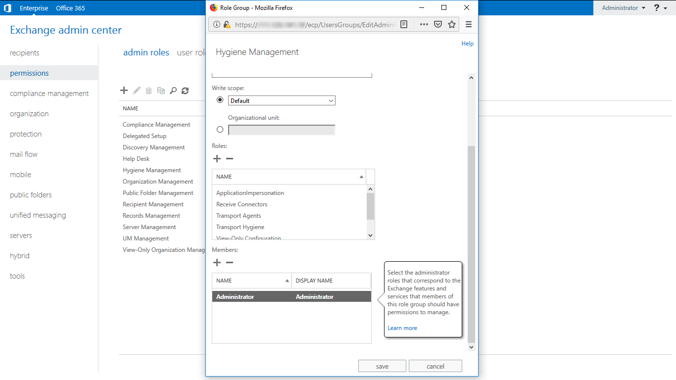 Now, select the hygiene management. You need to add "ApplicationImpersonation" role and member.
