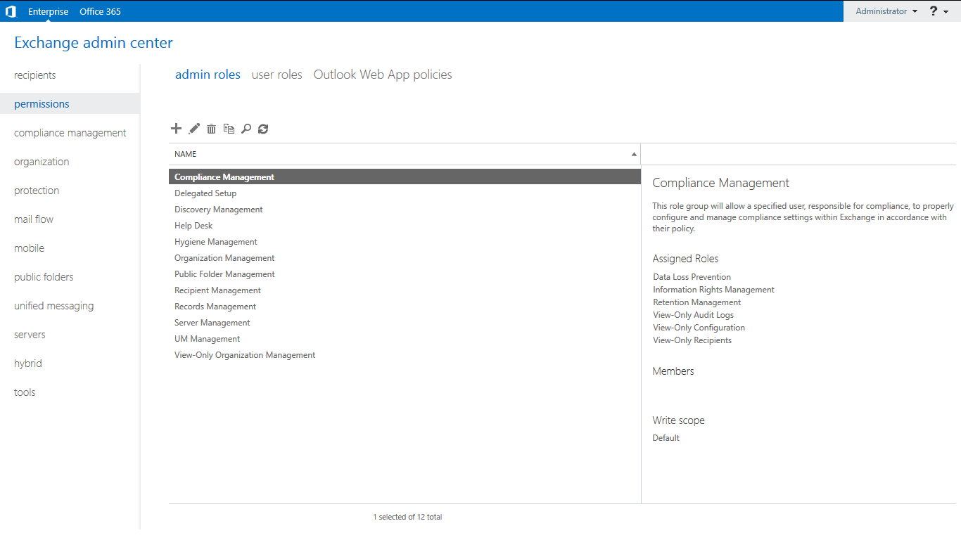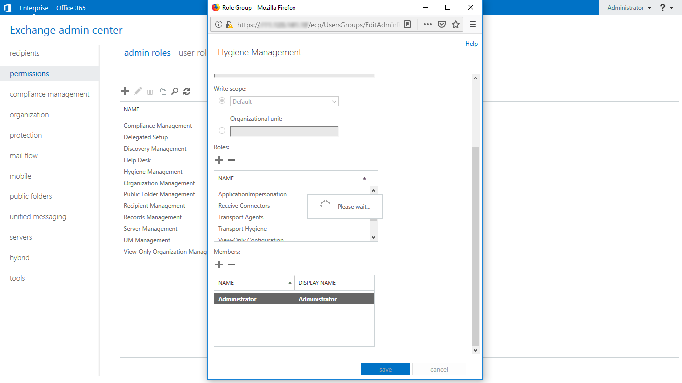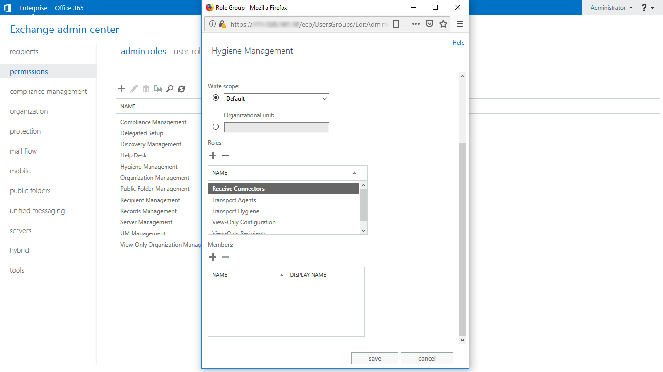 Now, select the hygiene management. You need to add "ApplicationImpersonation" role and member.