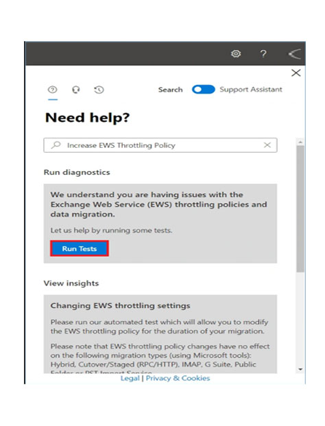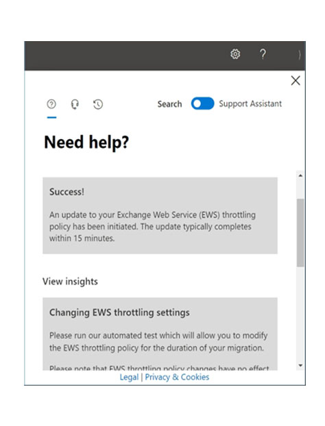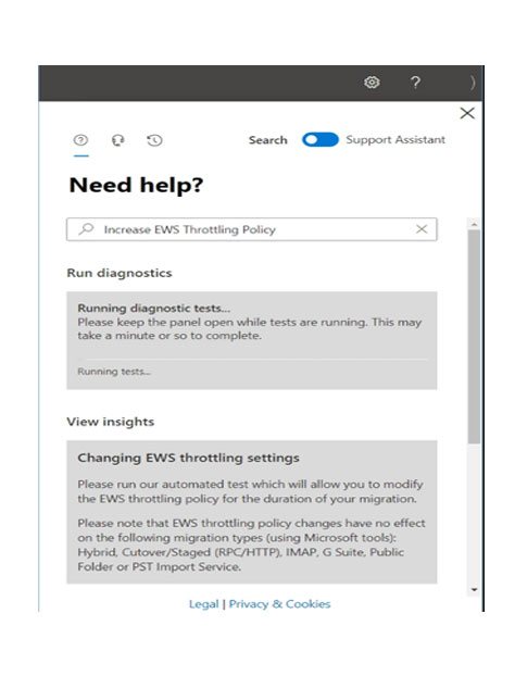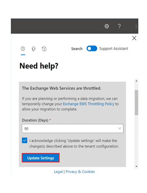 6. A message will appear, “If you are planning or performing a data migration, you can temporarily change the Exchange EWS Throttling Policy to allow the migration to complete“.Input the number of days for the Duration and click Update Settings. The available options are 30, 60, and 90 days.